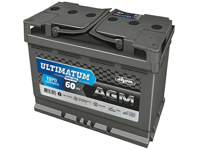 Аком Ultimatum AGM – это новая линейка аккумуляторов, которая производится с применением технологии AGM (Absorbent Glass Mat) — это технология изготовления герметизированных свинцово-кислотных аккумуляторов с использованием абсорбированного электролита, что даёт ряд преимуществ в свойствах аккумулятора.