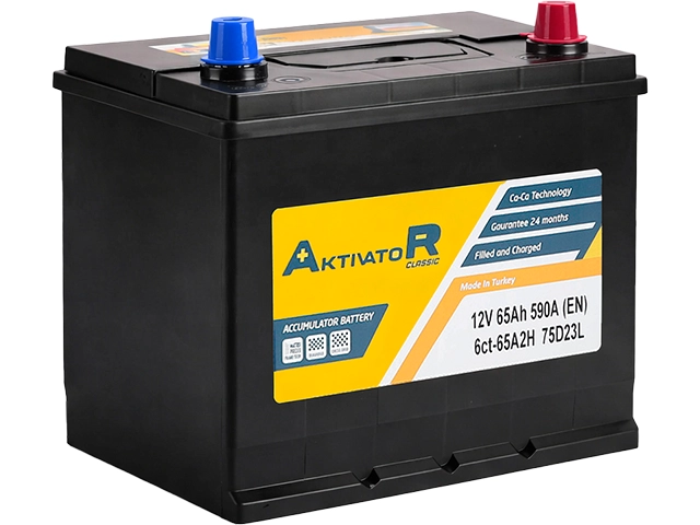 AKTIVATOR Classic 75D23L 65Ah 590A — аккумулятор, рассчитанный на уверенный запуск двигателя в повседневной эксплуатации. Емкость 65 А·ч и пусковой ток 590 A (EN) дают хороший запас на холодный старт и работу штатных потребителей