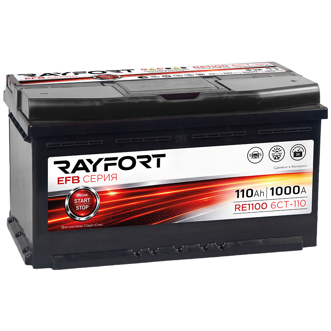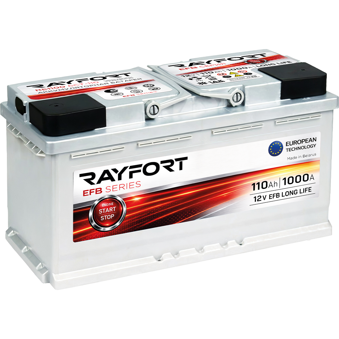 RAYFORT EFB RE1100 — стартерный аккумулятор, изготовленный по технологии EFB (Enhanced Flooded Battery) ООО «Зубр Энерджи» в Республике Беларусь. Ёмкость 110Ah, пусковой ток 1000A (EN), корпус L5 353×175×190 мм, масса не более 24 кг, обратной полярности. EFB — это улучшенный “залитый” свинцово-кислотный аккумулятор с повышенной устойчивостью к циклам и лучшим приёмом заряда по сравнению с обычными АКБ, рассчитанный на частые запуски и работу в городском режиме.