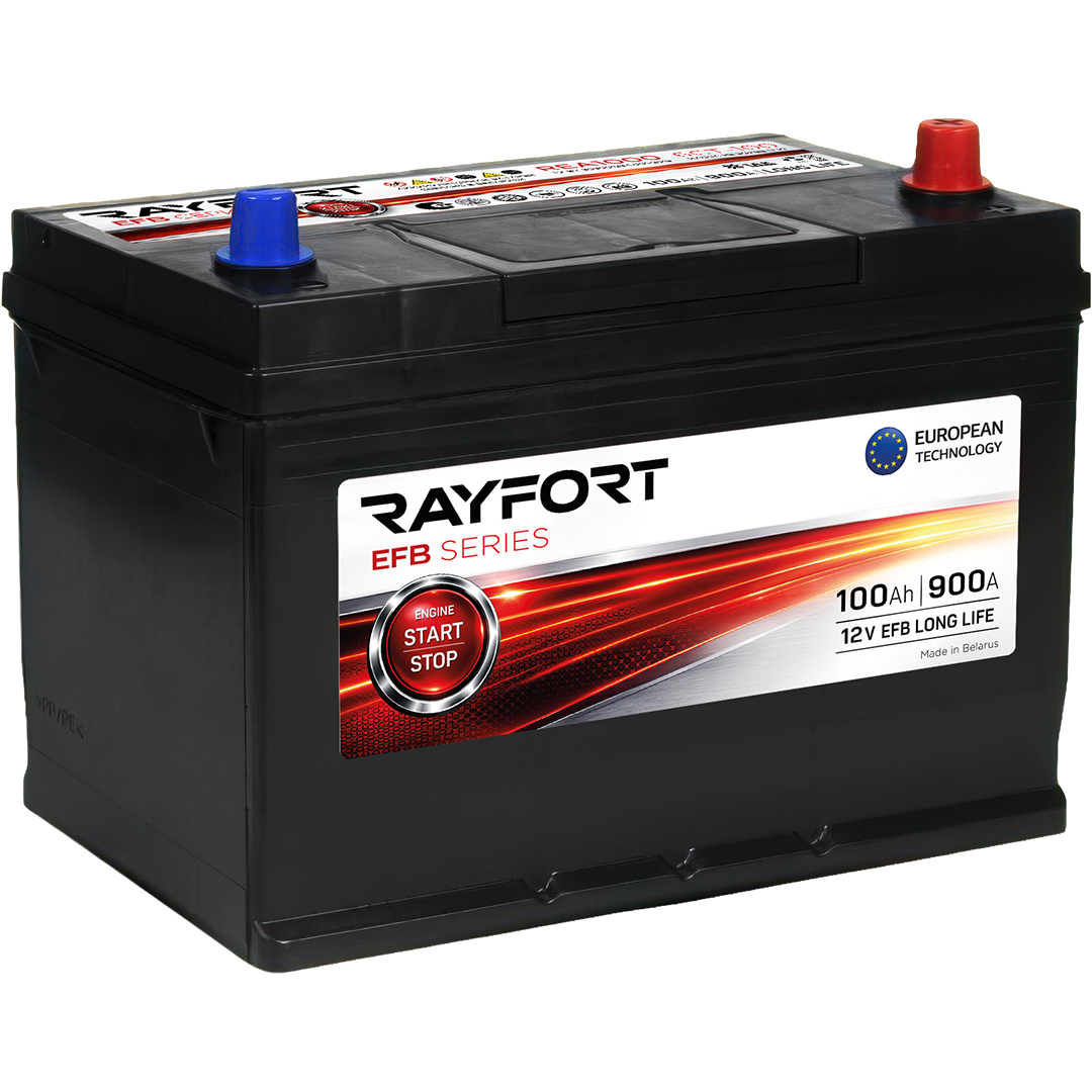 RAYFORT EFB REA1000 — стартерный аккумулятор, изготовленный по технологии EFB (Enhanced Flooded Battery) ООО «Зубр Энерджи» в Республике Беларусь. Ёмкость 100Ah, пусковой ток 900A (EN), корпус D31 306×173×225 мм, масса не более 23 кг, обратной полярности. EFB — это улучшенный “залитый” свинцово-кислотный аккумулятор с повышенной устойчивостью к циклам и лучшим приёмом заряда по сравнению с обычными АКБ, рассчитанный на частые запуски и работу в городском режиме.