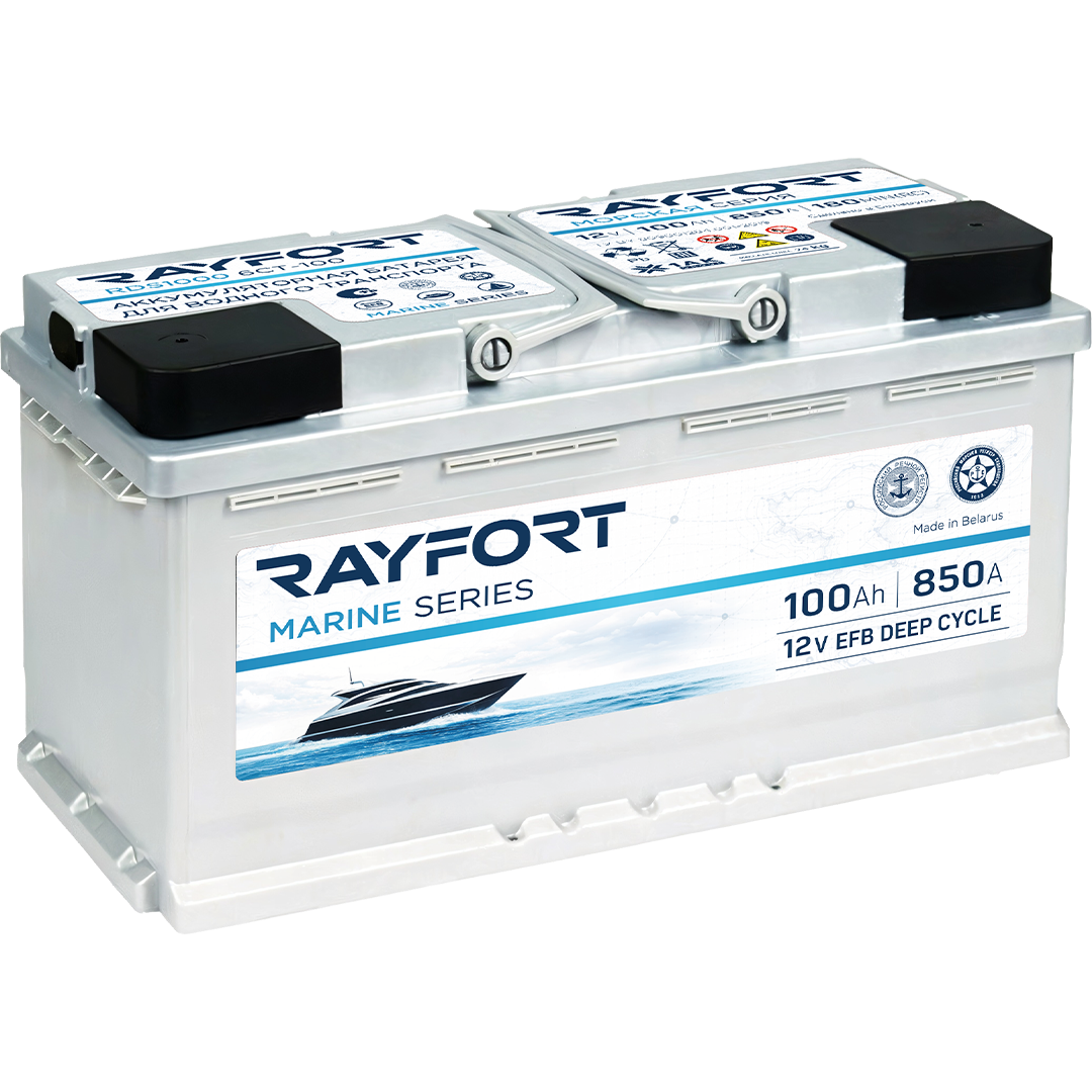 RAYFORT Marine RDS1000 — тягово-стартерный аккумулятор серии Marine, произведённый ООО «Зубр Энерджи» (Республика Беларусь). Модель выполнена по технологии EFB (Enhanced Flooded Battery) — это улучшенный свинцово-кислотный аккумулятор с жидким электролитом, рассчитанный на повышенную циклическую нагрузку и более эффективный приём заряда по сравнению с традиционными залитыми АКБ. Аккумулятор обеспечивает уверенный запуск и стабильное питание бортовой сети и дополнительного оборудования.