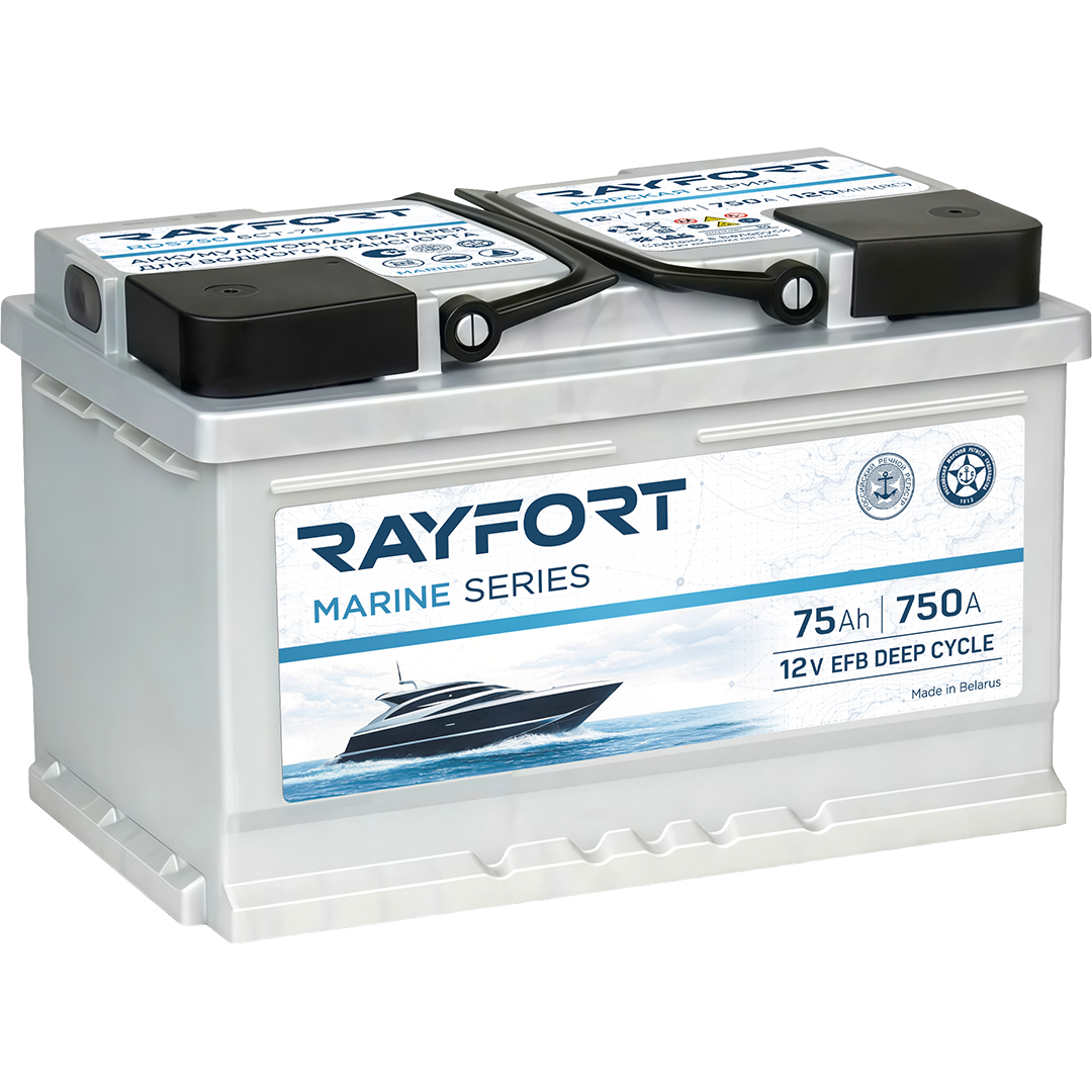 RAYFORT Marine RDS750 — тягово-стартерный аккумулятор серии Marine, произведённый ООО «Зубр Энерджи» (Республика Беларусь). Модель выполнена по технологии EFB (Enhanced Flooded Battery) — это улучшенный свинцово-кислотный аккумулятор с жидким электролитом, рассчитанный на повышенную циклическую нагрузку и более эффективный приём заряда по сравнению с традиционными залитыми АКБ. Аккумулятор обеспечивает уверенный запуск и стабильное питание бортовой сети и дополнительного оборудования.