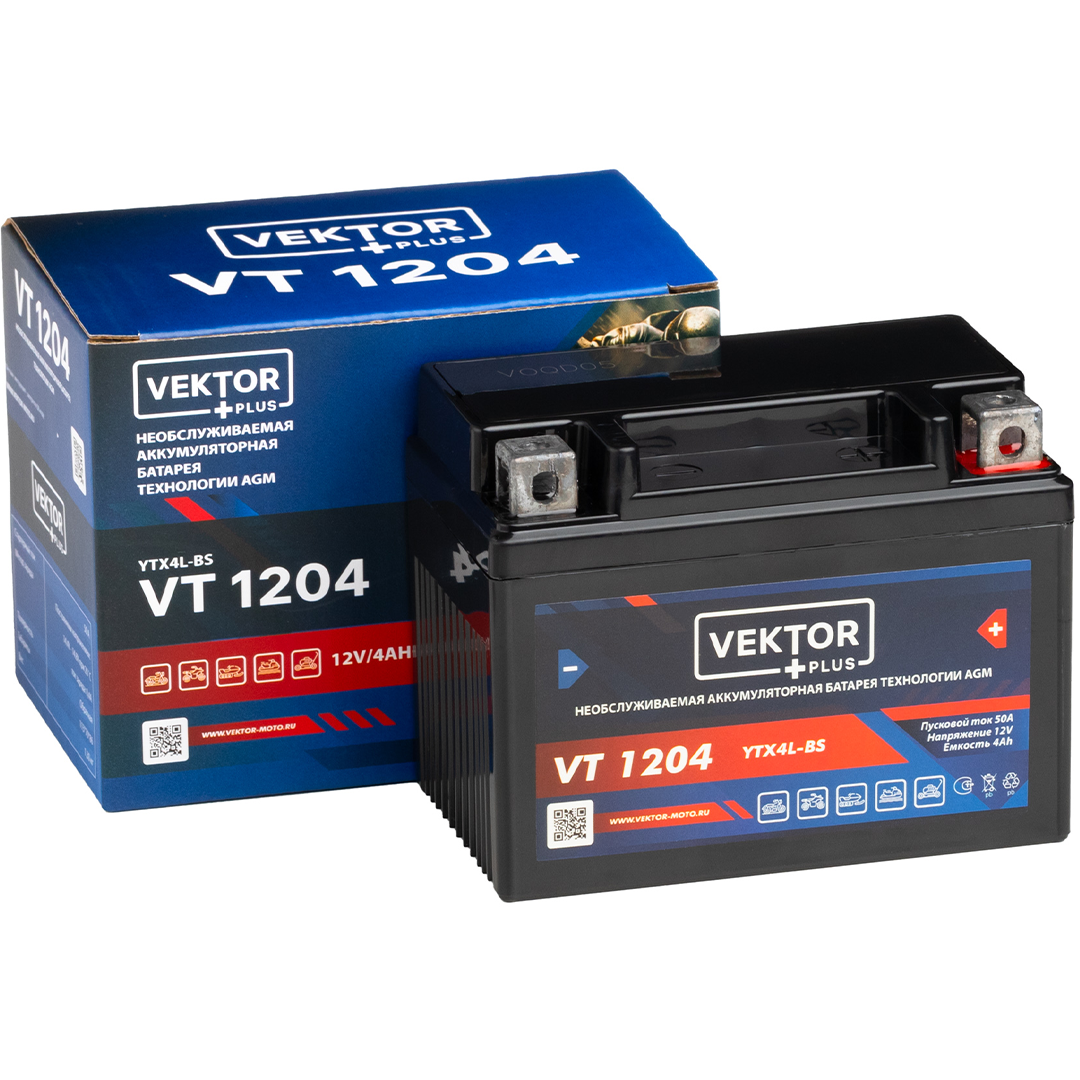 VEKTOR PLUS VT 1204 (YTX4L-BS) — герметичная свинцово-кислотная аккумуляторная батарея AGM-типа, не требующая обслуживания. Рассчитана на пусковые режимы и обеспечивает стабильный запуск техники в широком диапазоне температур. Компактные размеры и высокая виброустойчивость делают её оптимальным решением для мототехники и малых двигателей.