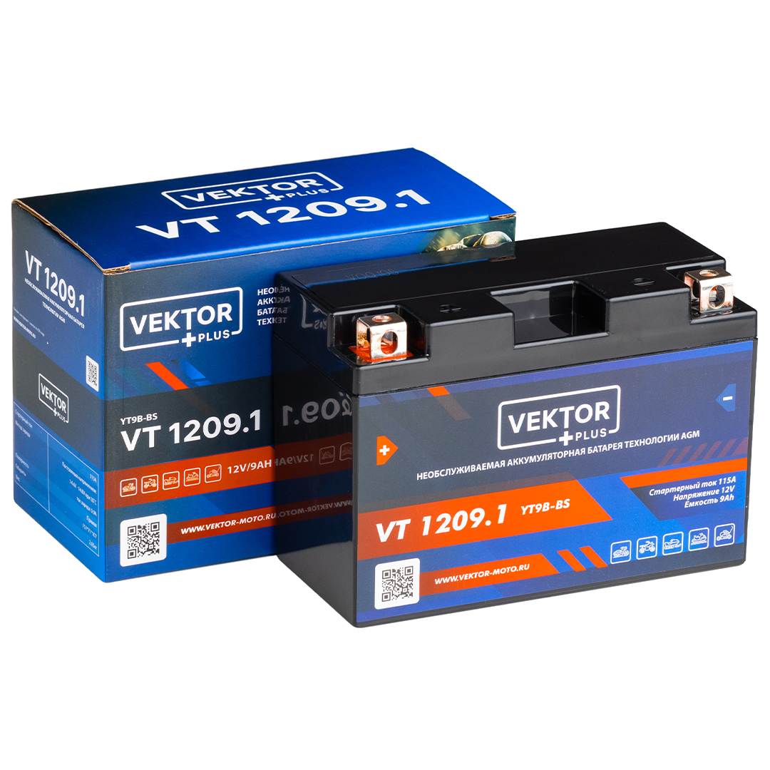 VEKTOR PLUS VT 1209.1 (YT9B-BS) — необслуживаемая свинцово-кислотная аккумуляторная батарея AGM-типа, предназначенная для запуска двигателей. Герметичная конструкция исключает необходимость обслуживания и обеспечивает стабильную работу при вибрациях и перепадах температур. Компактные размеры и надежные пусковые характеристики делают модель удобным решением для различной мототехники.