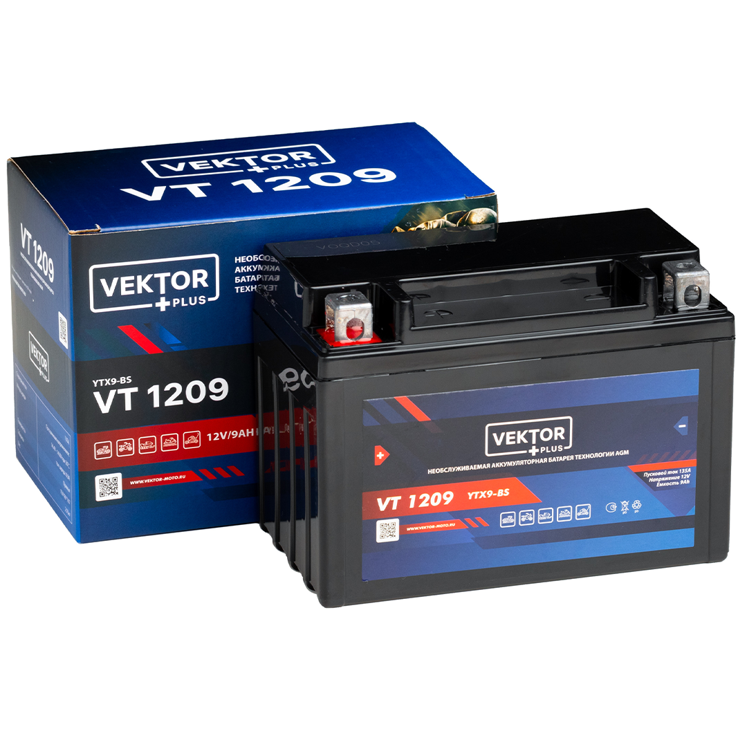 VEKTOR PLUS VT 1209 (YTX9-BS) — необслуживаемая свинцово-кислотная аккумуляторная батарея AGM-типа, предназначенная для запуска двигателей. Герметичная конструкция обеспечивает отсутствие необходимости в обслуживании и надежную работу в условиях вибраций и температурных перепадов. Повышенные пусковые характеристики делают модель подходящей для техники с более высокими требованиями к мощности запуска.