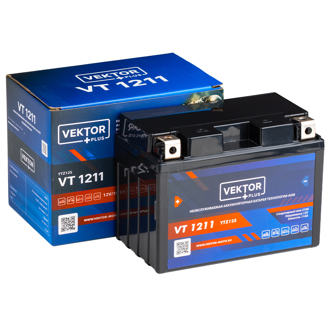 VEKTOR PLUS VT 1211 (YTZ12S) — необслуживаемая свинцово-кислотная аккумуляторная батарея AGM-типа, предназначенная для запуска двигателей. Герметичная конструкция исключает необходимость обслуживания и обеспечивает стабильную работу при вибрациях и перепадах температур. Модель сочетает компактные размеры, повышенную емкость и высокий пусковой ток.