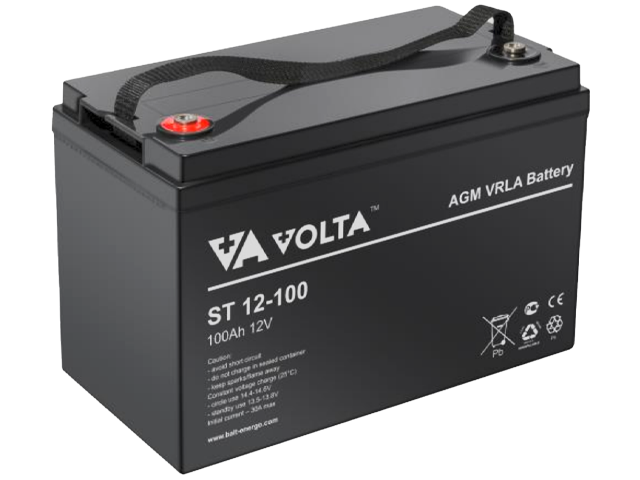 Свинцово-кислотный аккумулятор VOLTA ST 12-100 — герметичная необслуживаемая батарея общего применения, изготовленная по технологии AGM с системой рекомбинации газов (VRLA). Применение высококачественного свинца, прочных сепараторов и усовершенствованной конструкции решётки обеспечивает высокие разрядные характеристики, надёжность и длительный срок службы до 10 лет.