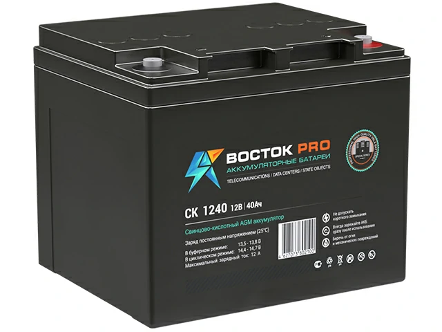 Свинцово-кислотные аккумуляторы Восток серии CK предназначены для использования в системах бесперебойного питания, резервного энергоснабжения, автономных энергосистемах. Изготовлены по AGM технологии (электролит, абсорбированный в стекловолоконном сепараторе), являются герметизированными и необслуживаемыми, со сроком службы в буферном режиме до 10 лет. Обладают высокими разрядными и эксплуатационными характеристиками благодаря использованию в составе электролита и намазной пасты специальных добавок, препятствующих коррозии и замедляющих процесс старения.