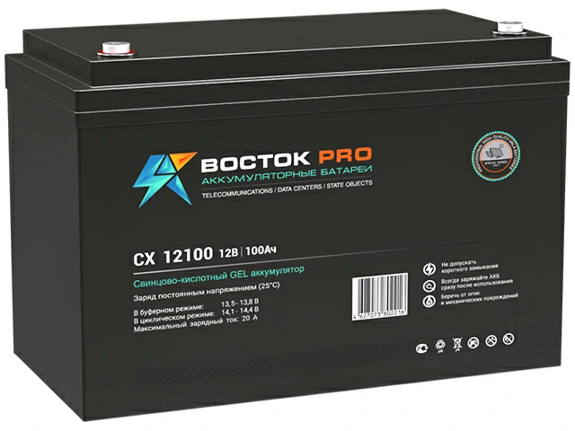 Свинцово-кислотные аккумуляторы Восток серии СХ предназначены для использования в системах электропитания на основе возобновляемых источников энергии, в т.ч. солнечной и ветроэнергетики, автономных системах энергоснабжения. Являются герметизированными и необслуживаемыми, со сроком службы в буферном режиме до 10 лет. Изготовлены по технологии GEL: при производстве в качестве электролита используется композитный гель (загущенный в гель раствор серной кислоты), что обеспечивает высокую устойчивость батарей к глубоким разрядам (оптимальны при эксплуатации в циклическом режиме) и стабильную работу в условии перепадов температуры окружающей среды.